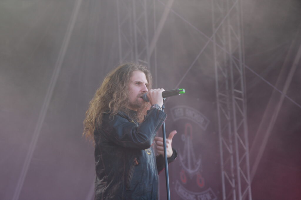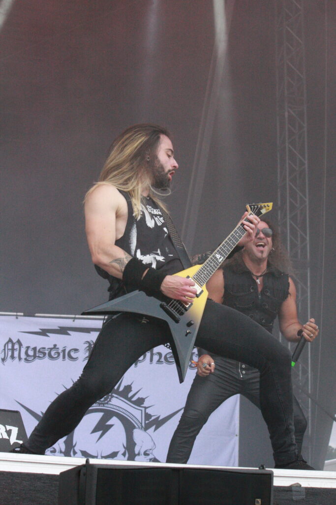 „Klassisch“ mit modernem Heavy Metal geht es auf der anderen Bühne mit MYSTIC PROPHECY weiter. Während die Band einen absolut überzeugenden Auftritt hinlegt, wird die Aufmerksamkeit des Publikums aber mehr und mehr nach oben gezogen. Dunkle Wolken ziehen auf, es beginnt mal wieder zu regnen, und so kommt, was leider kommen muss.
