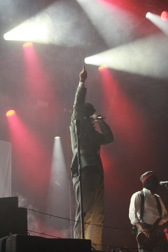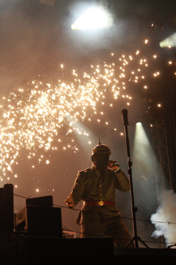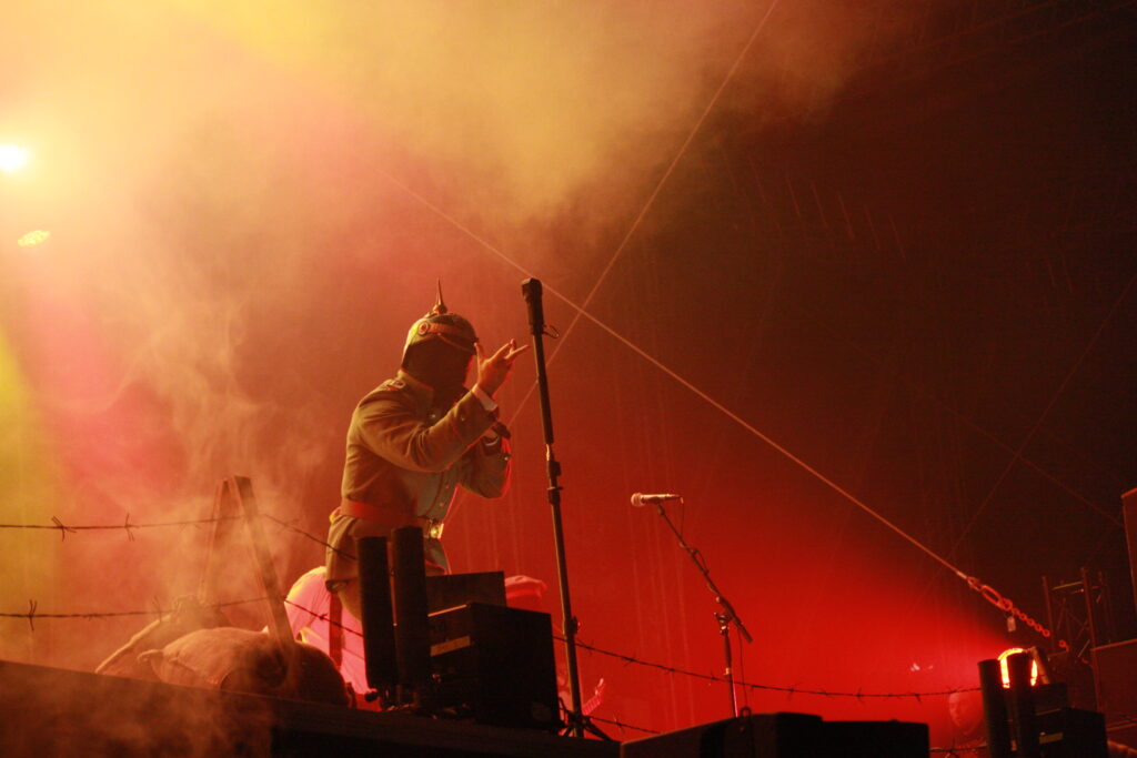 KANONENFIEBER schließen den Abend ab. Stacheldrahtzäune, Sandsäcke und Haubitzen zieren das Bühnenbild, die Band betritt in Uniform die Bühne, und danach wird martialisch angehaucht mit ohrenbetäubender Lautstärke über den ersten Weltkrieg gesungen. Ich hatte die Band nicht auf dem Schirm und mich bislang nur oberflächlich damit befasst, und so schwingt eine bizarre Mischung aus Faszination und Fassungslosigkeit mit. Die Band positioniert sich zwar ganz klar, aber irgendwie ist das nichtsdestotrotz Grauzone, und wer da was für sich raushören will, der kann das ziemlich sicher auch. Mit Flammenwerfern und sonstigem Pyro endet der erste Tag…